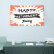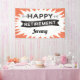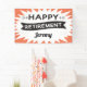 Happy Retirement party banner with retro style and vintage fonts including scroll and arrow motifs and starburst background with orange. Personalise by editing the name line.