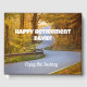 Happy Retirement Enjoy the Journey with custom name. The photo shows a road curving through autumn woods up a hill and on into the distance. Great for a retiree who plans to do a lot of RV travel or road trips. Friends or coworkers can write memories and good wishes at a retirement celebration.
