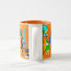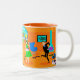 This Happy Retro Parents Mug shows a mum and dad rejoicing as their child makes a dash for the school bus. The celebrating duo are in their 1960's style, mid century modern, living room. The orange decor is anything but understated. There is turquoise, cone fireplace and a bright, blue, egg chair against an orange, stone wall. On the wall, there is Mid Century Modern Globe Art Stretched Canvas Print, which is available from StrangeLittleOnion's own Zazzle store. On the floor, there is a blue and black portable record player with several vinyl albums scattered nearby. Dad, is wearing a black suit with a light blue dress shirt and darker blue tie. He is breaking out all of his best dance moves--the kind that would bring eye rolls from junior. Mum is wearing a vibrant, green dress and a flouncy, white apron with blue trim. She is standing in front of sliding glass doors cheerfully waving as her child runs down the front sidewalk towards the waiting yellow school bus. Through the doors, we can see their perfectly manicured, suburban lawn and proverbial, white picket fence. Even the background looks happy with a turquoise sky and the silhouettes of cedar trees.