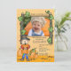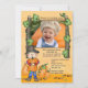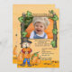An adorable scarecrow is gathering pumpkins in this fall-theme invitation. Autumn leaves collect at his feet and your favourite photo is featured in a vine pole frame. Suitable for either gender and any child's age.