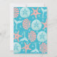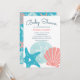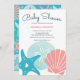 Beach theme baby shower invitation features sand dollar, starfish (sea star) and scallop seashells in tropical coral and aqua blue. Reverse side is a nautical shell, whale tail & swirls pattern on a turquoise background. Perfect for beach, nautical, Under the Sea, coastal, and island themed baby showers. Original artwork KL Stock.