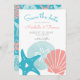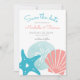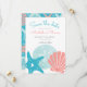 Beach theme wedding Save the Date card features sand dollar, starfish (sea star) and scallop seashells in tropical coral and aqua blue. Reverse side is a nautical shell, whale tail & swirls pattern on a turquoise background. Perfect for beach, nautical, coastal, summer, seaside and island themed weddings. Original artwork KL Stock.