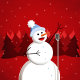 Christmas postcard with an illustration of a happy snowman singing with a microfone. Snow is falling, snowflakes everywhere, and a forest of pine trees can be seen in the background. This snowman postcard has cheerful white and red Christmas colour scheme with a touch of blue and orange.