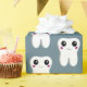 Wrapping paper with a drawing of a big white tooth with a cute kawaii smile and big happy eyes.