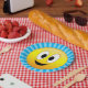 Make your party or picnic fun with this happy plate. A big round happy yellow face. Round yellow face with big oval eyes and a jolly open smiling mouth. The background is a blue sunburst pattern.