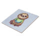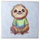 Ceramic tile with an adorable illustration featuring a happy looking sloth wearing a green t-shirt. Sitting cross-legged looking relaxed.