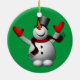 This cute snowman motif is a happy snowman with red mittens and scarf on a dark green background.