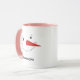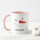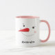 Cute holiday coffee / hot cocoa mug features a happy winter snowman face with warm rosy cheeks, carrot nose, eyes and smile made of coal. Snow white, black, pink and orange design colors. Personalize with a name or other custom text.