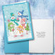The five brightly dressed and smiling snowmen on the front of this card seem quite happy....and why not? It's getting close to Christmas, and the sky is filled with white snowflakes! This delightful retro image is colourful, fun, and framed in pretty turquoise. The hats and scarves in blue, green, gold and red brighten the scene, and one little snowman holds a small green Holiday tree with a silver star and a candy cane bottom. Cute! The inside text is fully customisable, so you may personalise it or make it say whatever you'd like.