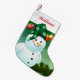 Your kid will be very anxious to hang this Christmas stocking above the fireplace knowing that this cute little snowman with green hat will never melt.