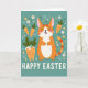 Designed with a sweet spring scene, this card features a stylized cat-like creature with long, pointed ears like a little hare 🐰. Orange stripes wrap its body above a white belly, and its closed eyes, rosy cheeks, and tiny pink tongue give it a tender, friendly look. The background is a muted teal, setting a calm stage that makes the warm orange tones stand out. Around the character, several orange root vegetables appear both singly and in small bundles, their leafy green tops leaning in as if gathered close together. Small white and yellow blossoms are sprinkled across the teal space, and a few white curling flourishes add gentle motion like a breeze through a garden 🌷. The shapes have a layered, cut-paper feel that adds soft depth without looking busy. Along the bottom edge, the words “HAPPY EASTER” sit in large white letters, centered and easy to read. Tiny blossoms and white swirls float near the upper corners against the teal background.