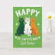This card shows three stylized cats posed front-facing in a neat row on an emerald green background dotted with small white shamrocks ☘️. In the middle sits a white cat with dark green spots, leaning slightly toward its companions as if enjoying being close. A deep forest green cat stands on the left and a ginger-orange cat on the right, and their gentle smiles and wide yellow eyes give the scene a friendly, affectionate feel 💚. Near the top, the word “HAPPY” appears in large white letters, centered above the cats. Just below that, “ST. CATTY’S DAY” is written in matching white type, also centered and easy to read. Lower down, the phrase “Little Brother” appears in smaller white text, tucked beneath the main greeting. The cats have smooth outlines with light shading, and the shamrock shapes repeat across the green field behind them.