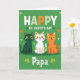 This card shows three cartoon cats lined up on a deep emerald green background, close enough that their rosy cheeks and bright yellow eyes seem to meet in a friendly, affectionate glance 💚. On the left sits a forest-green cat, in the middle a white cat sprinkled with lime-green spots, and on the right an orange tabby marked with warmer red-orange patches. Each cat has fine whiskers and a soft blush, giving them an easy, companionable look that feels like they’re sharing the holiday together. Across the top, the phrase “HAPPY ST. CATTY’S DAY” is set in big uppercase letters, with “HAPPY” shifting from white to spring green to orange. Small four-leaf clovers in mixed greens and a few orange accents float around the cats, with little starburst shapes scattered between them ☘️. Near the bottom, “Papa” appears in white, centered beneath the trio like a neat name tag. The overall style is flat and graphic, with simple shapes and sharp edges that keep the cats and clovers crisp against the solid green field. Around the cats, the clovers and starbursts are spaced like confetti, dotting the background from top to bottom.