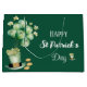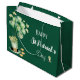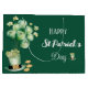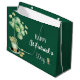 Happy St Patrick's Day large gift bag with Brunswick green balloons, shamrocks and a leprechaun hat and gold coins. A dark green background with white script lettering makes this perfect for St. Paddy's Day gift giving.