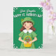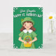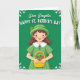This card shows a young girl centred on a deep emerald green background, looking out with a soft, rosy-cheeked smile that feels like a gentle hello from someone close 💚. She wears a leaf-trimmed green hat and a simple collared green dress, and her relaxed posture gives the scene an easy, affectionate warmth. In both hands she carries a bright yellow basket filled with small, abstract flowers in red, blue, orange, and pink, like a little spring bouquet offered to someone she cares about ☘️. The solid green backdrop keeps the focus on her face and the basket, making the colours stand out clearly. White decorative foliage curls into the corners, lightly framing her without crowding the centre. Near the top, “Dear Daughter” appears in white lettering, and below it “HAPPY ST. PATRICK’S DAY” is set in larger white text across the middle. The girl’s green outfit echoes the holiday theme while the multicolored flowers add a lively contrast against the rich green field. White leafy flourishes sit in the corners around the centred figure and the stacked white greeting text.
