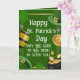Send heartfelt holiday wishes with this elegant St. Patrick's Day greeting card. The front features a festive green design with golden barrels, pots of gold, and shamrocks alongside the message, "May the Luck of the Irish be with you!"