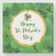 Coaster which says Happy St. Patrick's Day with a background photo of a field with green clovers. A circular frame with a FAUX gold foil border holds the text which is written in a trendy font and contains a green clover illustration.