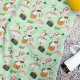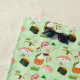 This charming design includes smiling Kawaii sushi, shrimp tempura rolls, Ikura rolls, California rolls, salmon, Maki, and tuna rolls.
