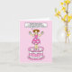 An illustration of a lady holding two cup cakes as she stands on top of a pink and white cake. The lady is saying 'Happy Birthday to someone special who is sweet sixty today'.