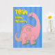 Big Pink dinosaur eating a leaf, with a birthday greeting on a blue background.