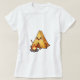 A cheerful and cozy illustration featuring an anthropomorphic yellow tent enjoying a night out. The triangular character sports a beaming smile and blushing cheeks while sitting cross-legged in front of a crackling stone-lined campfire. It happily waves with one hand while roasting a marshmallow on a stick with the other, capturing the pure joy of camping against a solid black background.