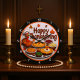 This cheerful round graphic is a festive tribute to Thanksgiving. A cartoon turkey in a chef's hat stands next to a feast of pies, cranberries, and vegetables. The text, 'Happy Thanksgiving,' is prominently featured, making this a perfect design for holiday greeting cards, decorations, or a dinner invitation.
