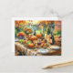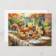This holiday postcard showcases a digital illustration of a Thanksgiving feast. The dinner is served outdoors on a table adorned with a plaid tablecloth, flowers, and candles. Personalise the greeting or purchase as shown with "Happy Thanksgiving" in a script font. AI image designed by Susang6