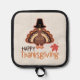Celebrate Thanksgiving with this adorable pilgrim turkey pot holder on faux linen that's wishing everyone a "Happy Thanksgiving".