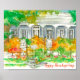 A "Happy Thanksgiving" poster decorated with colourful autumn foliage growing along a garden fence in front the porch on a white house with tall trees in the side yard drawn with pen and ink and watercolor.
