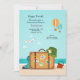 Happiness is travelling no matter the mode or destination. This charming invitation features hot air balloons, an aeroplane, suitcase with a Tyrolean hat, ski boot and a red sand pail on the beach.