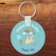 A birthday thank you keychain with a whimsical child-like theme. Designed on a blue green background. A happy unicorn frolicks underneath a colourful rainbow with fluffy clouds. Flowers, butterflies and strawberries add a charming touch to the design.