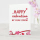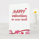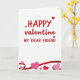 This greeting card features a white background with a big red message in the center that reads, “HAPPY valentine MY DEAR FRIEND.” “HAPPY” sits at the top in uppercase block letters, while “valentine” is written just below it in a smooth script style. The words “MY DEAR FRIEND” appear underneath in smaller block letters, keeping the message clear and friendly. Small red hearts are worked into the lettering, including one on the “H” in “HAPPY,” one used as the dot over the “i” in “valentine,” and another near the end of the message. Along the bottom edge, a red ribbon curls across the card with several hearts around it, shifting from deep red to a softer pink. The overall look feels warm and focused on friendship and affection, with the red details standing out strongly against the white space. ❤️