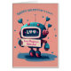 Cute Happy Valentine's Day card featuring a blue, pink robot with blue hearts holding a sign with the text 'Love Program Activated'. Original design by Inge Lewis and AI. This heartwarming and fun card will certainly bring lots of smiles to anyone. Browse for more matching products at the ingeinc.com shop / boutique.