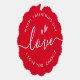 Ornament card featuring the text "love" in an elegant script font with two cute, pink hearts above. Customisable name and text "Happy Valentine's Day". Red or custom colour background. Add a custom photo on the back.