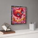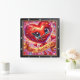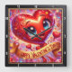 This cheerful square wall clock features a whimsical digital illustration of a smiling heart character with large, expressive blue eyes. The vibrant red heart is decorated with ornate swirls and sparkling accents, floating amidst a sea of smaller hearts and golden light. A flowing parchment banner draped across the bottom displays the festive greeting "HAPPY VALENTINE'S DAY!" in bold red lettering. The high-energy background is filled with shimmering stars, swirling ribbons, and colorful orbs, creating a celebratory and joyful atmosphere. The artwork is housed within a modern black wood-grain frame with bold white numeric markers for easy timekeeping. This functional home accessory is an ideal decorative piece for classrooms, playrooms, or as a fun Valentine Day gift. Its playful design and bright color palette provide a warm and welcoming focal point for any interior space.