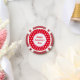 Red background with white polka dots... white centre circle with red lettering... and pink accents...