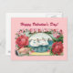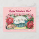 Custom Valentine's Day postcards with a pair of beautiful white swans floating on a lake framed by red roses and pink forget-me-nots. Click Customise It to add your own personal greeting to either side!