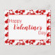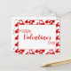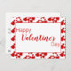 This Valentine's Day postcard is red and white. 'Happy Valentine's Day' is in red text on the front. The border has a pattern of red hearts. The back has two lines of black display text. You can edit it to show a personalised message and your name.