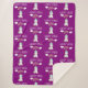 A patterned sherpa blanket with a cute illustration of a white unicorn sitting on its rump smiling and looking happy. Smiling clouds and a rainbow overhead. Text says: Happy Vibes. Adorable uplifting image. With a pinkish purple background.