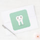 A sweet little white kawaii cartoon tooth with shiny, round, black eyes and a black mouth that is smiling. He also has rosy cheeks. The background is a soft green colour.