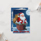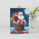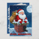 "Happy Christmas card with Santa, who joyfully climbs out of a chimney on the snow-covered roof of a house. Surrounded by winter nights, sparkling stars and festive moods, the cartoon design gives you pure joy. Perfect for wishing a Merry Christmas to family, friends or children and giving a smile."