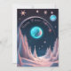 Snow-covered trees create a magical winter landscape under an ethereal night sky, where glowing planets and stars illuminate the scene. A path winds through the frosty forest, inviting exploration of this serene, otherworldly setting.