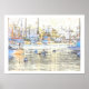 Beautiful digital art from a photograph, done in very light colours and lines, of a Harbour at dawn with a Brown Pelican in the middle on a bouy. See as large poster or print or smaller.