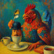 Hard-Boiled Human - Fowl Play at Breakfast. A surreal, witty twist on the breakfast table where a flamboyant chicken turns the tables on humanity. In a world obsessed with control, this image humorously reminds us that nature quietly sustains, mocks, and ultimately outlasts our attempts at dominance. It’s a bold, colourful piece balancing absurdity with a serious reflection on our place in the natural order.