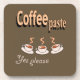 Hard plastic coaster, titled Coffee Paste, a funny Coffee Copy Paste Pun, with a copy of three coffee mugs and a "yes please" request a the bottom , brown background