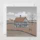 Colourful artwork of an old medieval house in the English countryside, with an old church in the background, and a couple of hares boxing in the foreground. Perfect for anyone who loves folk art.