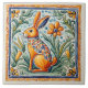 summery sicilian ceramic tile,italian hand painted pattern,mediterranean hare rabbit portuguese,blue orange bunny nature,summer spring botanical countryside,bold flowers floral flower,authentic classic traditional painting,vintage antique rustic country,folk art spanish mexican talavera,cream green yellow animal