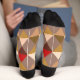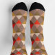 Socks in a Mid-Century Modern Harlequin pattern of stacked triangles forming diamond shapes - shades of deep red, beige, and olive on a taupe tan background