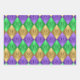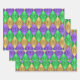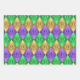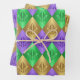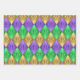These decorative gift wrapping paper sheets feature a harlequin-style pattern of diamonds in the traditional Mardi Gras colors of purple, green, and gold with the fleur-de-lis colors matching the colors of the diamonds on which they are situated. The fleur-de-lis symbols and diamonds are colored in a satin gradient style. Each sheet is aligned to have a different color in the center.