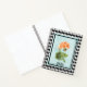 Pretty Geranium botanical style illustration on distressed light denim background with black and white harlequin pattern frame. Customise with year, monogram or other text